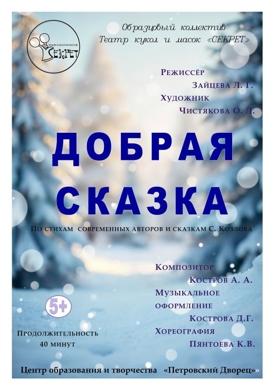 Приглашаем Вас 18 января в 12:00 на спектакль «Добрая сказка» театра кукол и масок «Секрет»! Это история о том, что настоящий праздник не зависит от даты в календаре. Он живет внутри каждого из нас. Мы покажем, как легко стать волшебником для другого человека и почему, отдавая частичку тепла, мы сами становимся в сто крат счастливее.